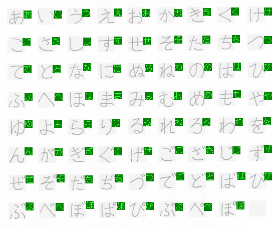 「あ」~「ん」、「が」~「ぽ」 の文字を認識しました。濁点や半濁点の文字も認識できます。